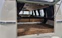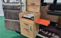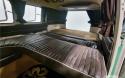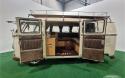 The craftsmanship continues inside. The interior has been handmade in oak with proper dovetail joints, complemented by new antique-leather upholstery that gives the cabin a warm, premium, timeless feel. Hidden modern comforts elevate the experience further: a compressor fridge, Bluetooth stereo in the cab, a lithium battery system, and a solar panel discreetly mounted on the 6-bow Westy-style roof rack. It’s all the usability of a modern camper, quietly integrated into a show-winning vintage shell.