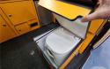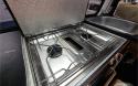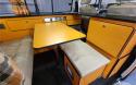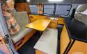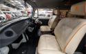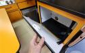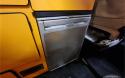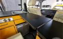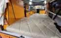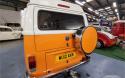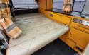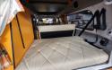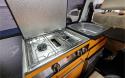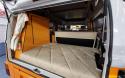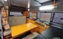 Inside, the specification is exceptional. A beautifully trimmed leather interior with orange piping complements the exterior, alongside a wooden steering wheel, matching orange furniture, and thoughtful storage throughout – including a buddy box, and hidden compartments. Sleeping four across the rock-and-roll bed and upper pop-top bunk, it’s a practical and comfortable camper ready for any adventure.